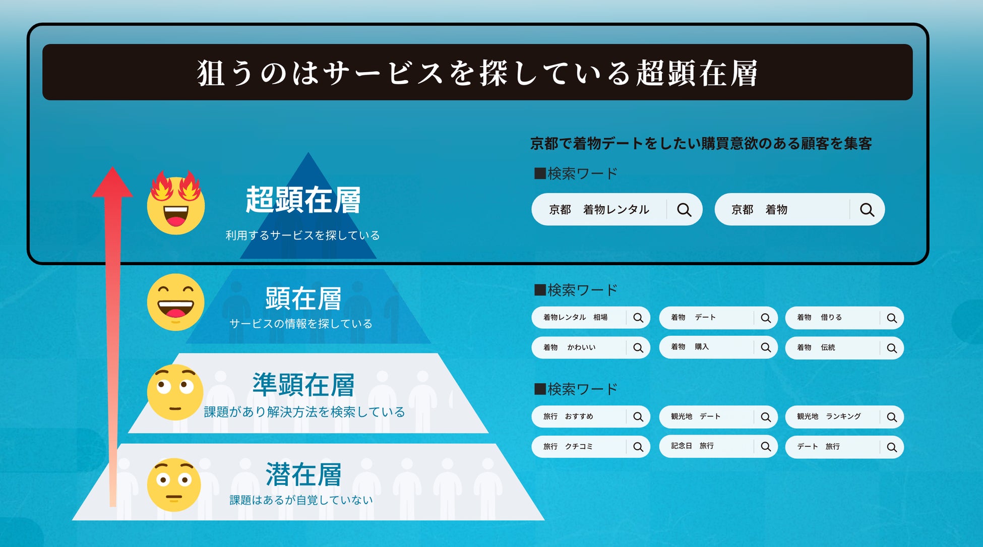 なぜなら集客するユーザーが売上に直結しない「層」ばかりを集客しているためです。そこで我々はサービス・商材を使う手前のユーザーである「超顕在層」へのSEO対策に特化しました。